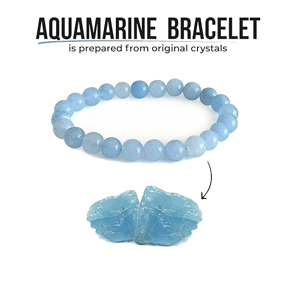 Aquamarine Bracelet with Lab Certificate for Men and Women - Natural Energised Blue Bracelet for Calmness, Money, Communication, Chakra Healing and Positivity - 8MM Beads